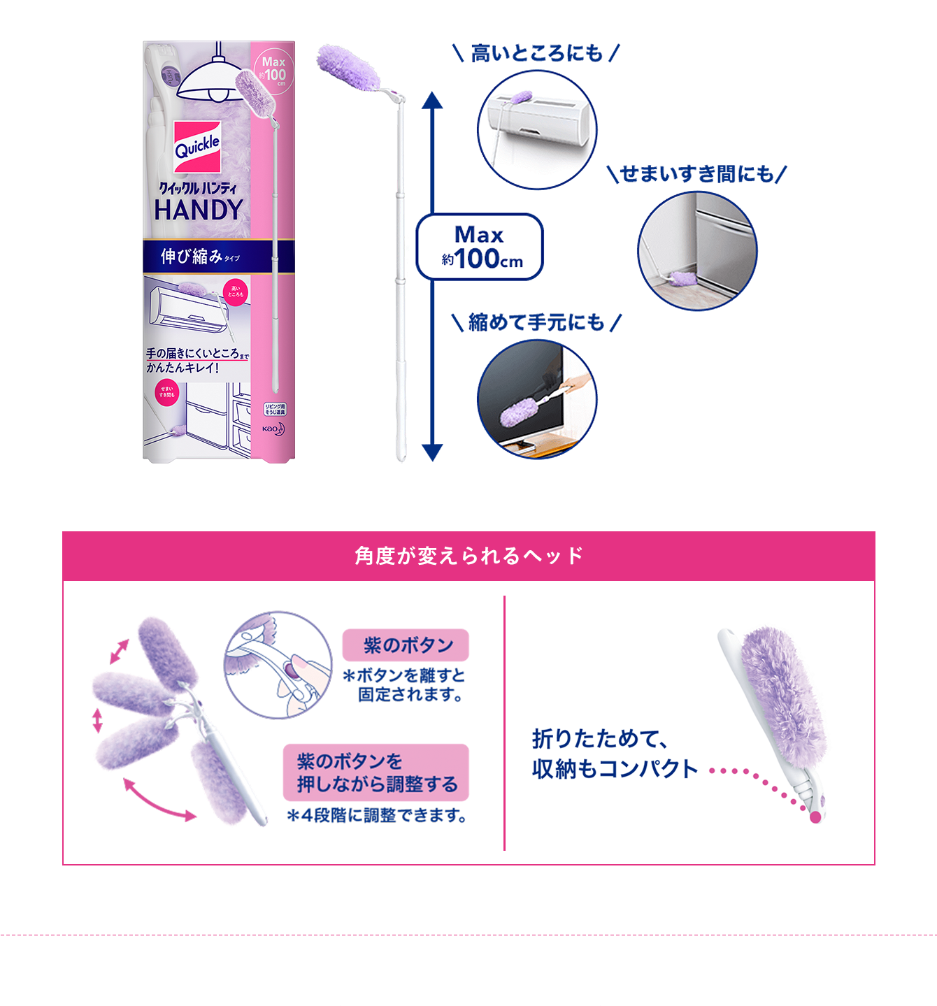 產品詳細資訊家居清潔不再需要爬高爬低!Quickle Wiper 伸縮除塵撢專為難以觸及的高位與隙縫設計。配合長度可調校的伸縮桿及可變角度的刷頭,不論是冷氣機頂、吊燈,還是傢俱縫隙,都能輕鬆打掃。